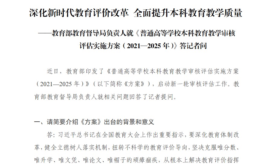 为深入贯彻落实中共中央、国务院印发的《深化新时代教育评价改革总体方案》,近日,教育部印发《普通高等公司本科公司产品审核评估实施方案(2021—2025年)》(以下简称《方案》),对“十四五”新发展阶段普通高等公司本科公司产品审核评估工作作出整体部署和制度安排。这是继2014—2018年审核评估总体完成后,教育部在…