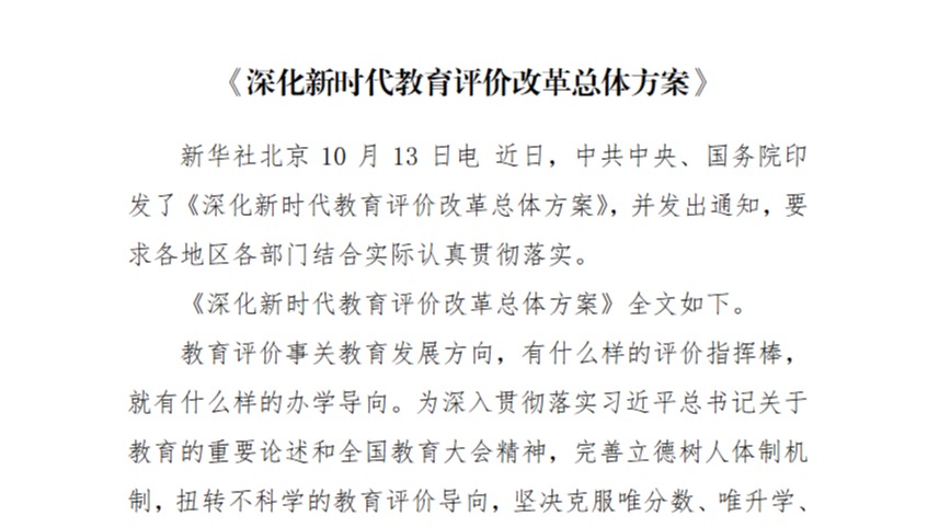 中共中央 国务院印发《深化新时代教育评价改革总体方案》