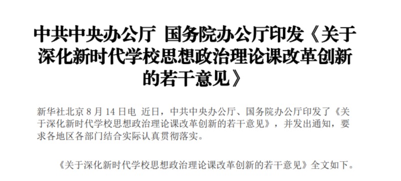中共中央办公厅 国务院办公厅印发《关于深化新时代公司思想政治理论课改革…