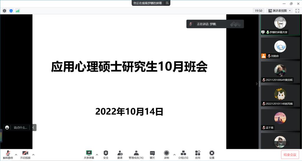 10月14日晚,mk体育召开了应用心理硕士研究生10月主题班会,会议由班主任罗娜主持,全体研究生参会。会上,罗娜组织全体研究生学习了贵州省教育厅和《关于恢复线下教学相关工作的通知》(校疫防办发〔2022〕25号)文件精神,并对近期疫情防控、恢复研究生线下教学、研究生安全稳定等工作进行安排部署。会议强调,首…