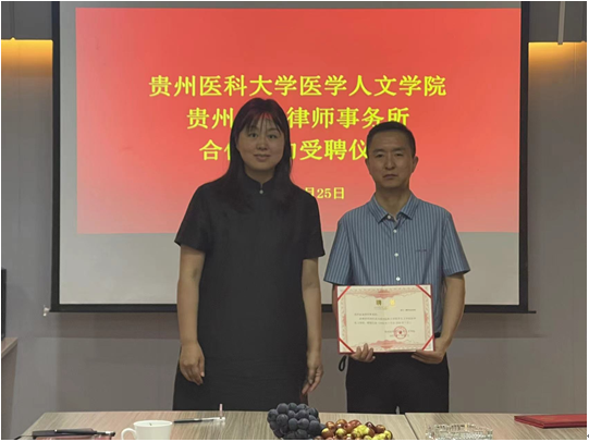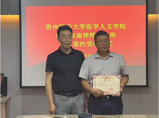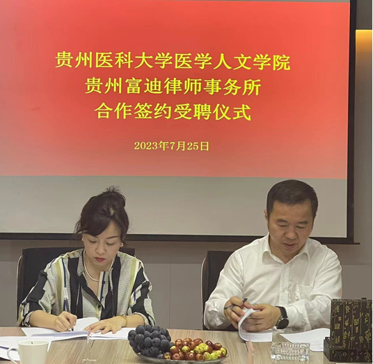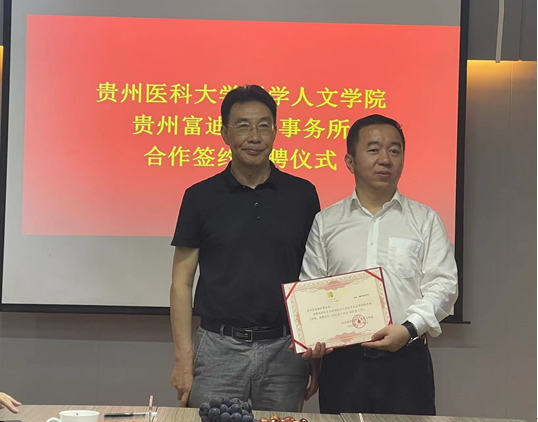 会上,江宣成代表公司向贵州富迪律师事务所授牌。韩贞习、张贤代表公司向归东、张柱都、颜仕武颁发校外实习导师聘书。彭丹代表公司签订全面合作协议及共建实践教学基地协议。