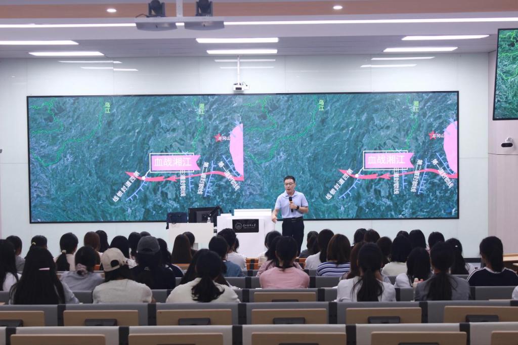 杨明结合历史地图和现场互动的方式,带领同学们重走那段烽火连天的长征路,重点阐述了四渡赤水战役所蕴含的战略思维和体现的长征精神。他鼓励同学们要从四渡赤水战役中汲取智慧和力量,既要抓当前,也要谋长远,将战略思维融入到自身的职业生涯规划。