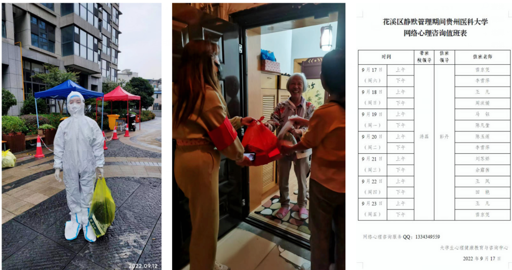 在老城区,教师田艳、陈凡莹、刘苏娇、余露茜、王凤等积极参与mk体育官方平台静默管理期间网络心理咨询服务、线上团体心理辅导,为多名贵医学子提供了疫情下的心理支持与干预。教师黄列玉作为志愿者主动参与云岩区半边街居委会所属社区的疫情防控工作,与医务人员一起参与核酸检测、抗原检测、物资发放等。教师龚红积极参加了盐务街居委会抗疫志愿者工作,为社区孤老送物资。教师张宛筑、王凤等参加了省委教育工委、省教育厅搭建的“贵州教育系统疫情心理援助平台”,为全省师生和广大群众提供心理援助,同心战“疫”,陪伴大家度过疫情下的特殊时光。