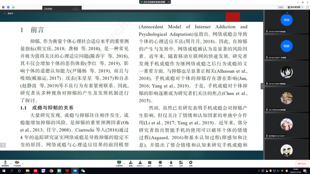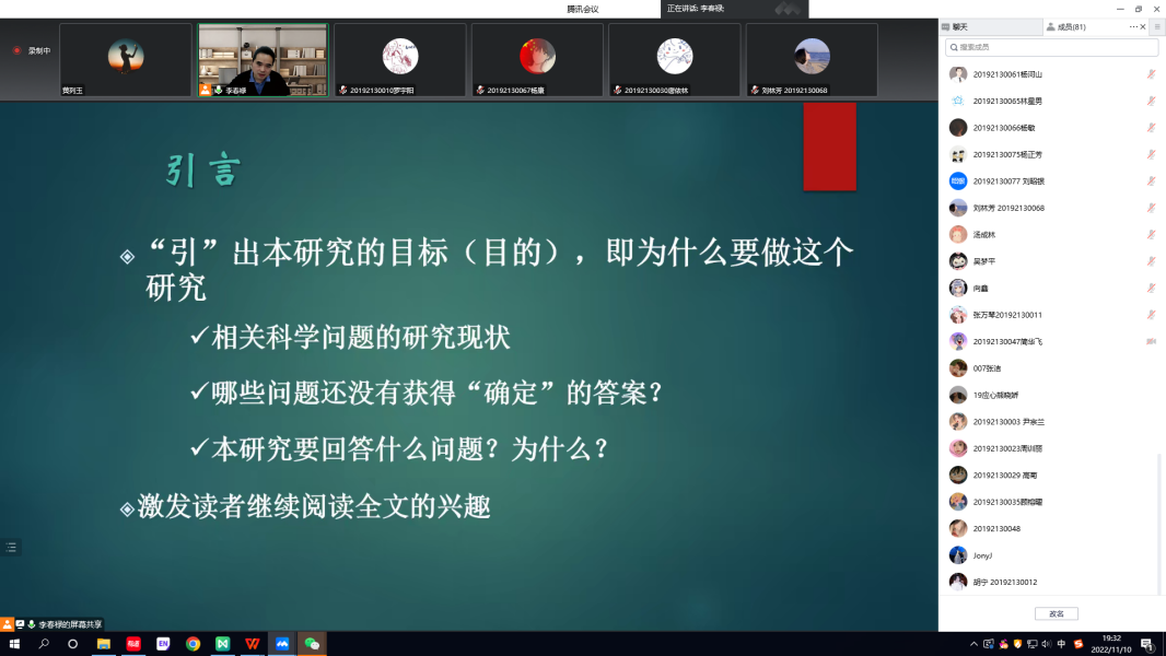 为提高本科生毕业论文写作质量,mk官网首页通过线上会议的形式,开展了本科生毕业论文写作指导培训,特邀了李春禄博士对2023届应用心理学专业员工进行毕业论文写作指导。培训中,李春禄首先从已有核心期刊发表的论文出发,对论文各个部分进行深入解读,向同学们讲解了心理学论文应遵守的写作规范和主要结构。同时,李春禄强调,科学研究论文的基本概念就是报告对某一科学问题进行研究的发现,这是表达对该科学问题的观点最为直接的方式。其次,李春禄还针对性地讲解了“文章标题的重要性”、“引言部分如何写作”以及“开题报告的内容格式”等重要内容。