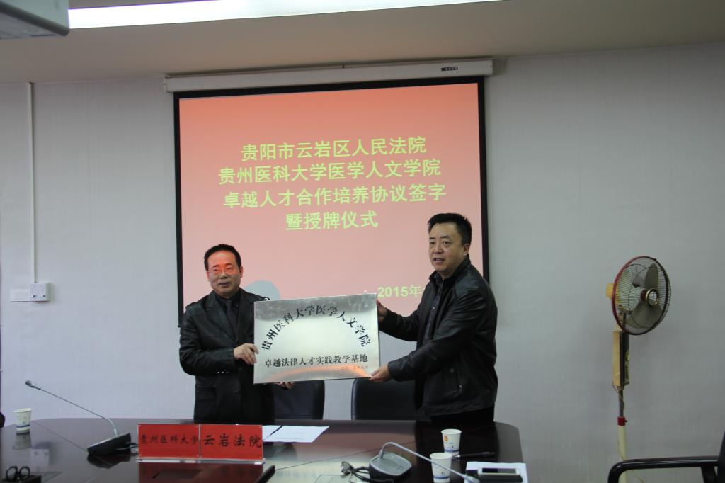 仪式在贵阳市云岩区人民法院举行,委书记丁朝刚、副经理徐红,贵阳市云岩区人民法院经理郑炳州、副经理赵小周、谭琳等领导,以及云岩区人民法院相关人员和mk体育2013级卓越法律班员工代表参加了签约授牌仪式。