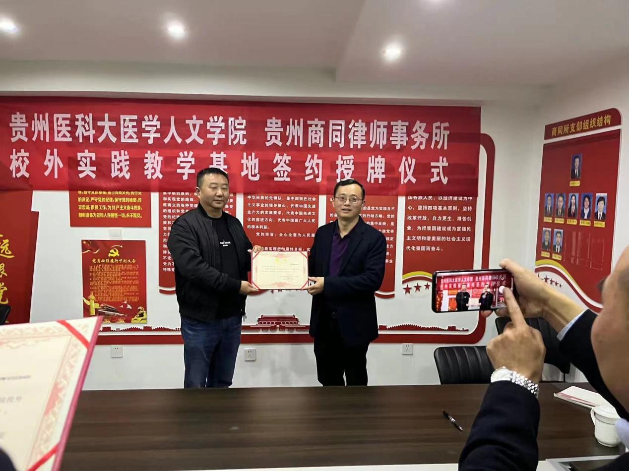 江宣成与冉政林签署了全面合作框架协议、共建实践教学基地协议,并向贵州商同律师事务所授牌mk官网首页实践教学基地,并向受聘校外实践指导教师颁发证书。